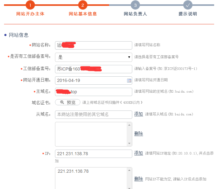 2、办理新增接入或者新增网站的时候,需要将之前错误的信息变更为正确,才能接入或新增网站,如果不能变更之前的信息,要先注销,然后再重新备案
