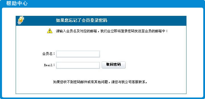 4、填写好您的会员名和当时注册的邮箱,点击取回密码,系统会自动发送密码至您邮箱内!(如图4)