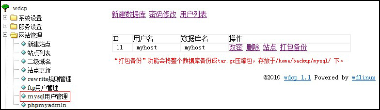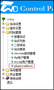 输入http://域名:8080 登陆到wdcp管理系统,点击phpmyadmin,如图: