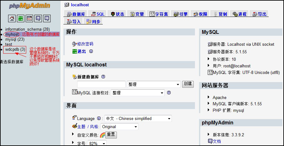 在phpmyadmin管理中点击您刚才创建的数据库,如myhost,进入到myhost数据库的管理界面。 注意:wdcpdb这个数据库不要修改和删除,误操作将会导致wdcp管理系统损坏!!如图:
