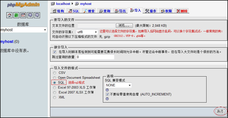 点击最上边的“导入”,选择您电脑上的sql文件以及对应的字符集,点击执行即可。如图: