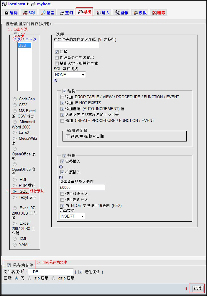 数据库导出: 点击最上方的“导出”,在左侧点击“全选”,选择所有的表,选择格式“SQL”,下方选择另存为,点击“执行”,如图: