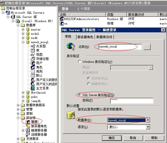 5、然后点击下边的“安全性”→“登陆”,右键点击“新建登陆”。新建登陆时,登陆名称可以填写您刚才建立的数据库名,验证选择sql身份验证,最下边的数据库选择您刚刚建立的数据库。如图: