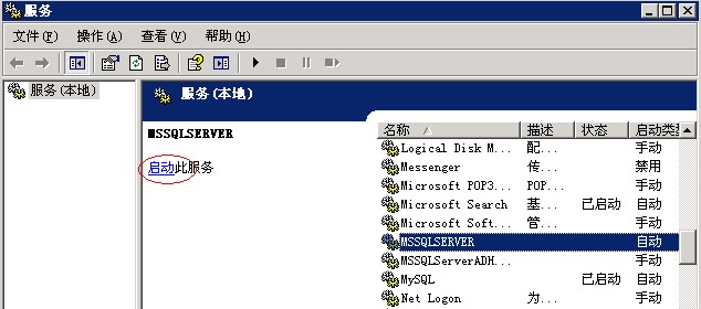1、我司的VPS一般都默认开通了MSSQL数据库,如果处于停止状态可以点击:开始→运行,输入services.msc,找到“MSSQLSERVER”服务,点“启动”,如图: