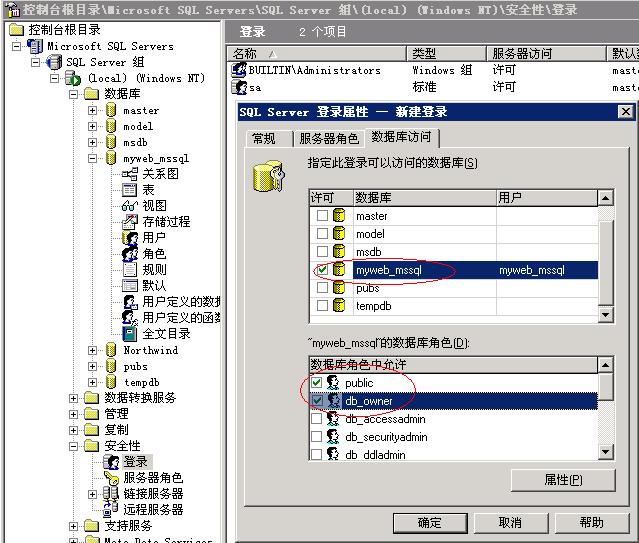 6、服务器较色不用设置,点击“数据库访问”选择您刚才建立的数据库,在“数据库角色”中勾选“public”和“db_owner”两个角色,点确定即可。如图: