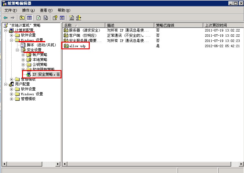 第一步:首先远程登录到服务器,远程登录请参考 http://www.com.top/help/productfaq/24.html 登录以后在运行里面输入gpedit.msc回车,依次展开 计算机配置--windows设置--安全设置 打开IP安全策略,然后找到allow udp,如下图所示: