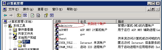 右键我的电脑--管理 进入后在配置-本地用户和组-用户,在右侧找到administrator帐户: