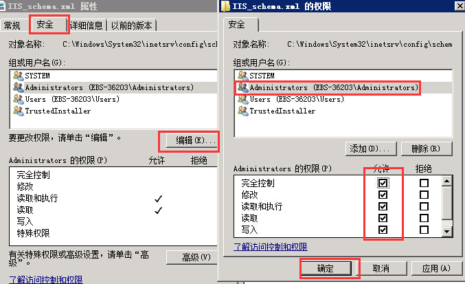 确认以后再次右键IIS_schema.xml文件--属性--安全--编辑,选中administrators 权限设置为完全控制,并确认。