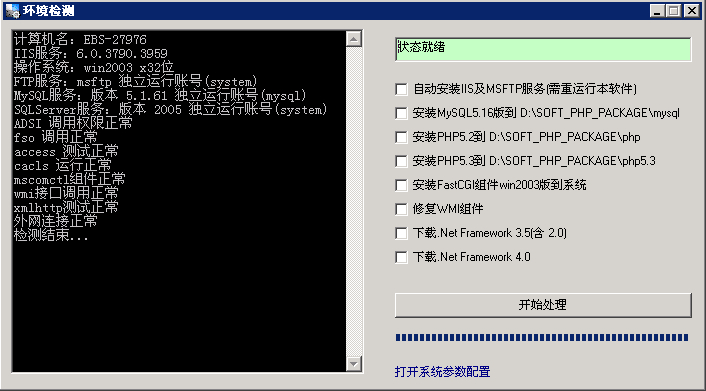 环境检测:可以检测当前的服务器及IIS、FTP等服务器环境是否正常,并可单独安装PHP、mysql等环境。注意,环境正常的情况下请勿点击安装环境系统,以免原有数据丢失。