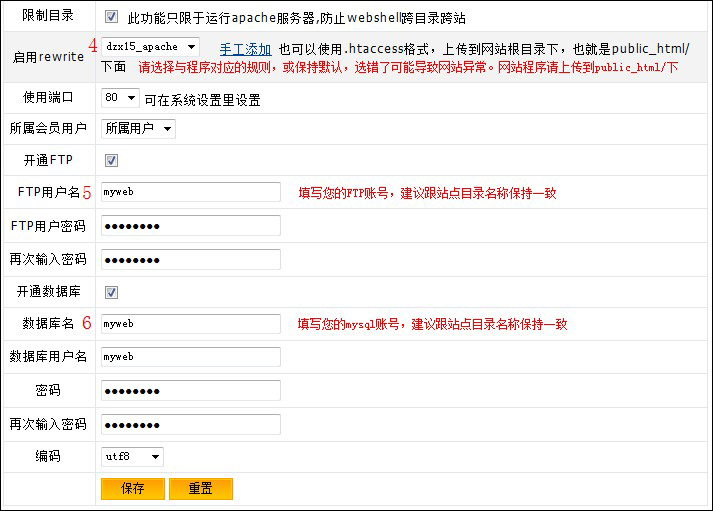 4、伪静态设置,请保持默认“无”,或者选择对应的伪静态配置,若自己不清楚是哪个版本,请选择“无”。 5、填写FTP账号和密码,建议跟站点目录名称一致,方便管理 6、填写mysql数据库名和密码,建议数据库名、数据库用户名和站点目录名称一致,方便管理。