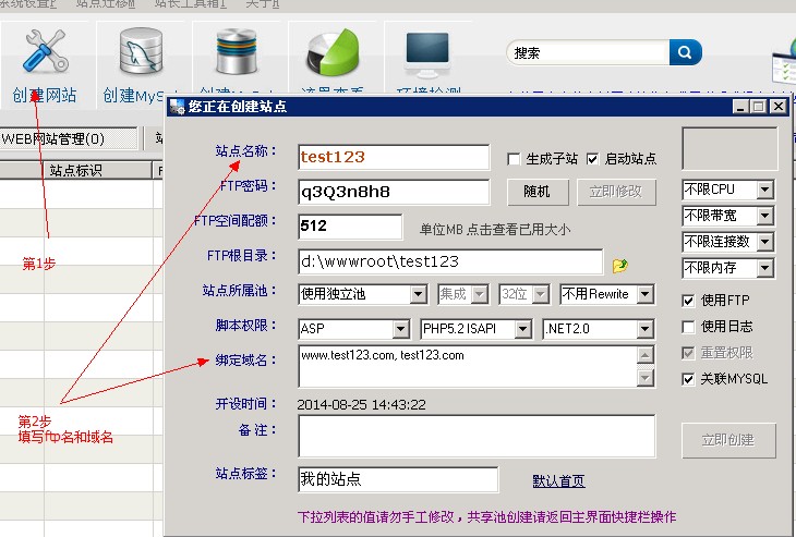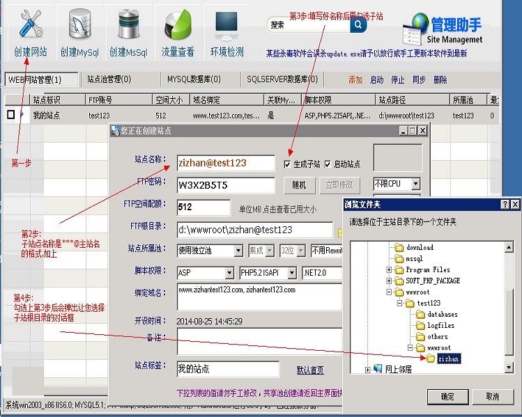 填写完毕,点击立即创建,完成主站建立 2.再次点击创建网站,在ftp名中使用****@主站ftp的格式(如bbs@test123等等),再选中"生成子站"的复选框,如图所示.