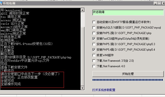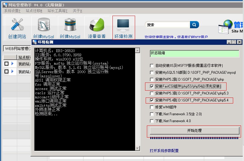 一、安装 打开建站助手,点击环境检测,勾选安装fastcgi组件和安装php5.4,点击开始处理