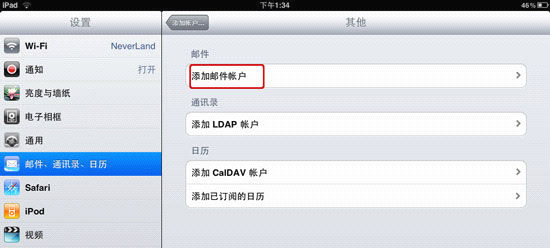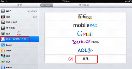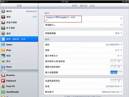 1. 以IPAD 为例,邮箱以support@fangmail.net 为例子,进入“设置”选项,点选“邮件、 通讯录、日历”,帐户类型选“其他”(如图1)