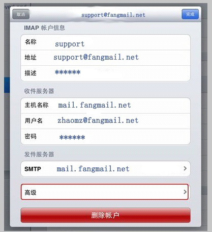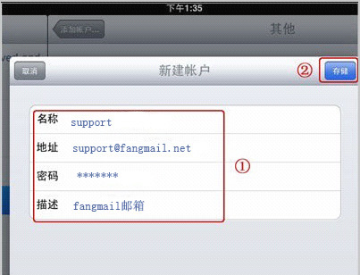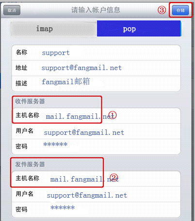 4. POP 帐户信息设置如下,填写好正确的用户名和密码,设置完毕后点击“存储”即可 在iPad 客户端使用开通了POP 功能的fangmail 邮箱了。 收件服务器主机名称:mail.fangmail.net 发件服务器主机名称:mail.fangmail.net(如图4)