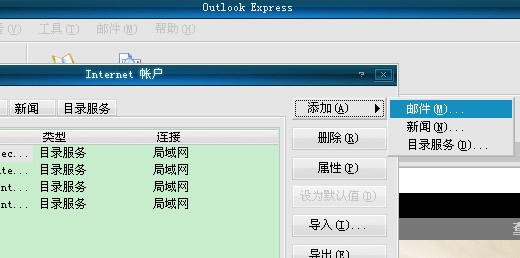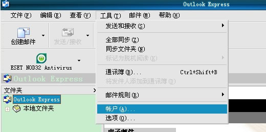 启动outlook,选择工具——账户(如图1)