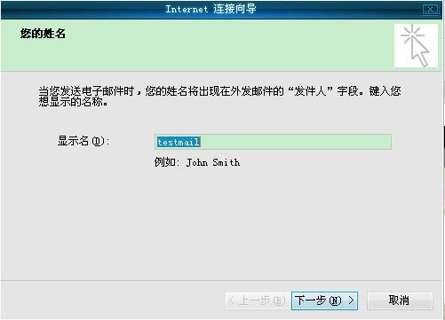 点击进入“Internet 连接向导”,输入你的“显示名”,如:“testmail”。此姓名将出现在你所发送邮件的“发件人”一栏,然后单击“下一步”按钮(如图3)