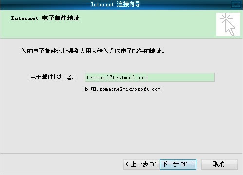 在“Internet 电子邮件地址”窗口中输入你的邮箱地址,如:testmail@testmail.com,再单击“下一步”按钮(如图4)
