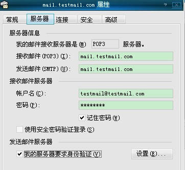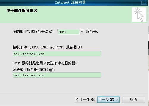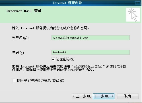 在“帐户名:”处输入你的用户名“testmail@testmail.com”。在“密码:”处输入你的邮箱密码,单击“下一步” (如图6)