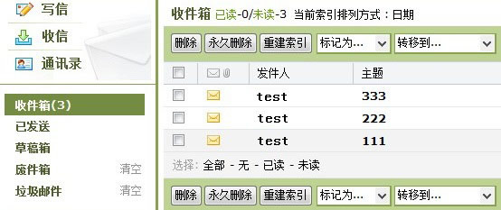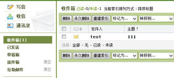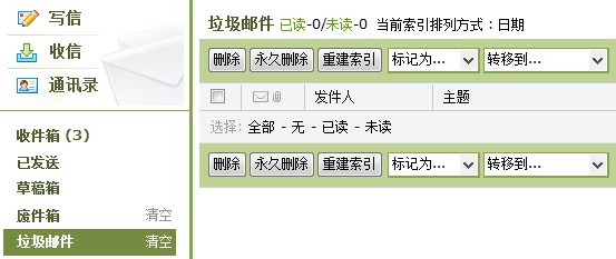 用户垃圾箱用来存放无用的邮件。这些邮件来自于:1)被用户删除的邮件;2)被用户转移到垃圾箱中的邮件。在垃圾箱中,邮件是按时间顺序以列表形式显示。 邮件列表显示了每封邮件状态、发件人、邮件主题、发送日期和邮件大小。