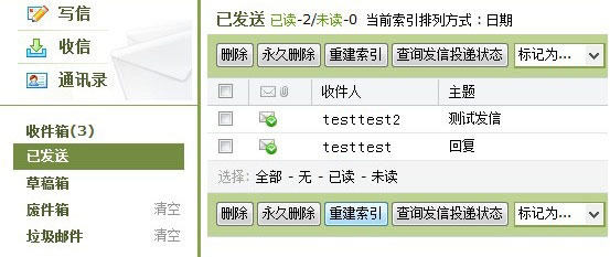 用户在发送邮件时选择“发送同时保存草稿到发件箱”功能,发件箱会自动保存邮件副本。点击进入发件箱,邮件是按时间顺序以列表形式显示。 邮件列表显示了每封邮件的标志、收件人、邮件主题、发送时间和邮件大小。