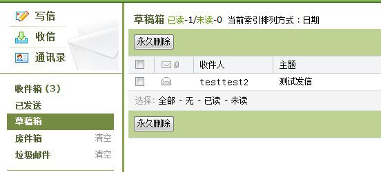 用户在撰写邮件时可以选择“保存草稿”,该邮件会自动保存在系统默认的草稿箱中,点击“草稿箱”进入用户草稿箱页面,其中邮件是按时间顺序以列表形式显示。邮件列表显示了每封邮件的状态、收件人、邮件主题、发送日期和邮件大小。