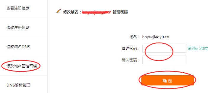 (2)登录解析控制面板后,点击修改域名管理密码,输入新密码,确认密码,最后点“确定”即可完成域名密码修改(如图2)