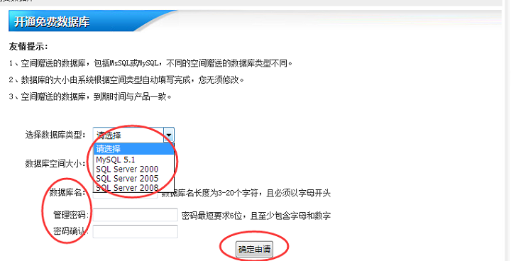 2、点击“申请数据库”后,选择要申请的类型,然后设置数据库名,数据库密码,确认密码,点“确定申请”即可申请成功。(如图2)