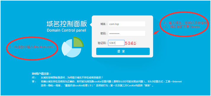 1.域名申请成功之后首先需要做域名解析。下面是解析域名的方法,首先登陆域名解析控制面板,在浏览器中输入http://dns.4cun.com/,界面如下图: