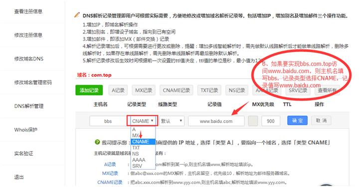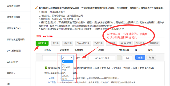 3.点“DNS解析管理”,然后点“添加记录”,可以做“A记录”、“ cname记录(别名记录)”、“ MX记录(邮箱记录)”