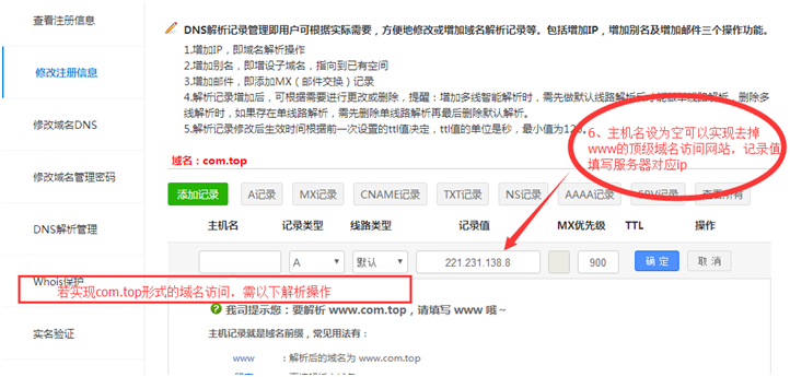 如想要实现去掉www.的顶级域名亦可访问网站,除了要在空间里绑定不加www.的域名外,还要解析,主机名为空,记录值填写空间的服务器ip,如图: