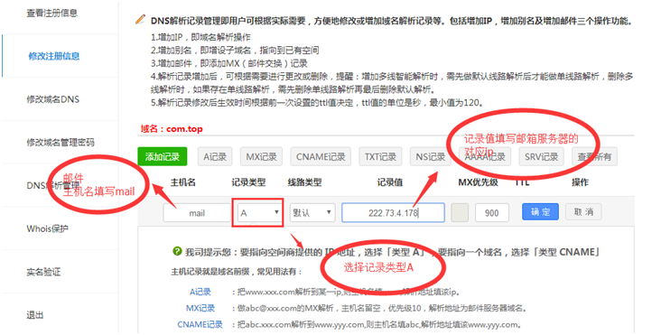 如果要访问邮箱界面,要做mail解析,点击“添加记录”,选择“A记录”到邮箱服务器域名,解析生效后可以使用http://mail.你的域名来访问邮箱,如图: