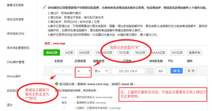 做好了泛域名默认的子域名都自动解析到泛域名指定的IP上面。*是通配符