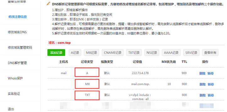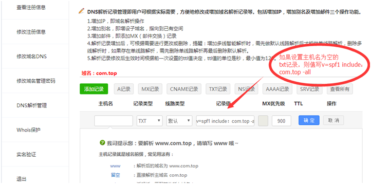 TXT记录可以用来设置邮件的Spf,用户在做邮箱记录的时候,可以建议再做一个TXT的SPF记录,以便于避免一些反垃圾邮件的屏蔽,具体设置如下: