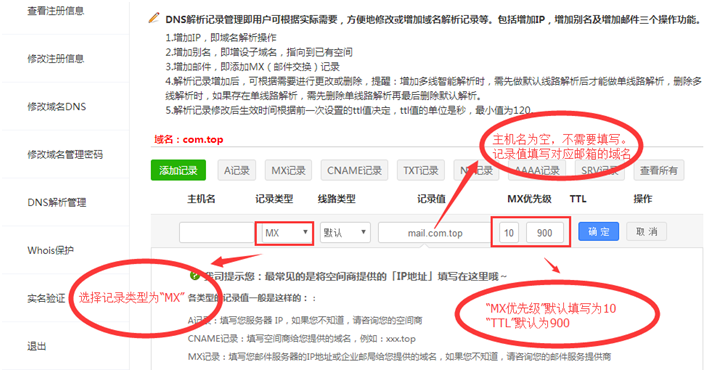确保收发邮件正常必须做“MX记录”,即选择记录类型为“MX”做一条解析,如图: