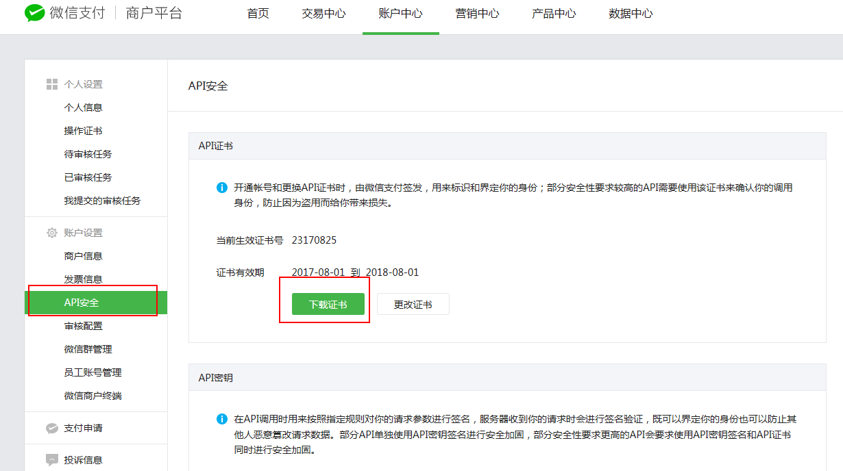 第三步:API安全>下载证书(可以下载到能够找到的位置)